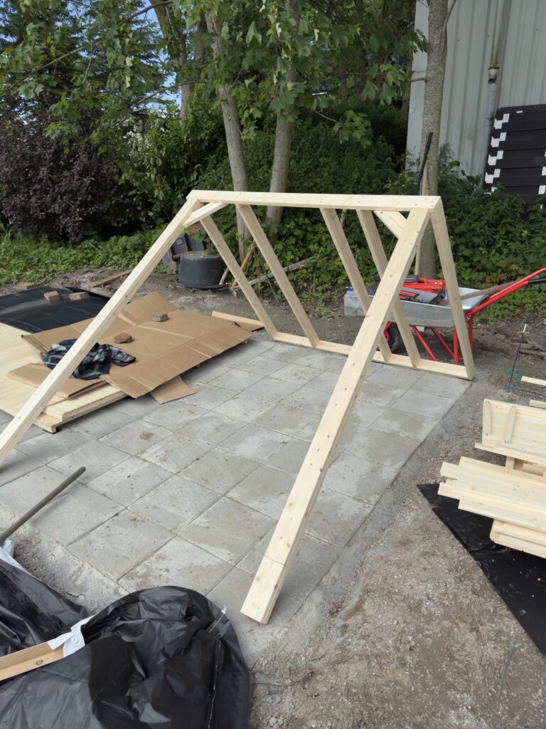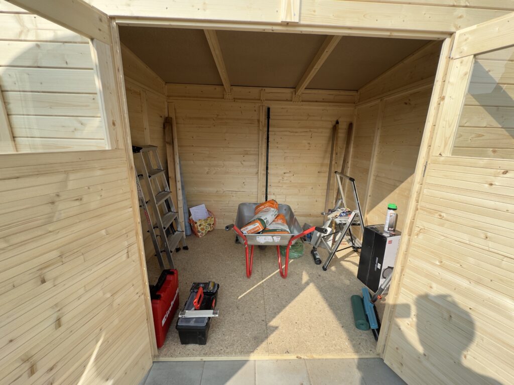 Gemeinsam mit einem Freund baute Sebastian den Gartenschuppen auf. Aus Brettern, Platten und viel Einsatz entstand innerhalb eines Tages das erste fertige Gebäude auf dem Grundstück.